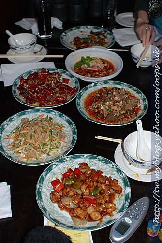 這家標榜多國亞洲菜色有包廂可以唱歌而且菜單上還有台灣的三杯雞,點來一盤長的就是個蕃茄燴甜椒雞肉=照片最下方那一盤哪裡像三杯雞了!?=.=還好味道還不賴!不過我個人比較鍾意最上面好像是椒鹽鴨舌和口水雞那兩盤。