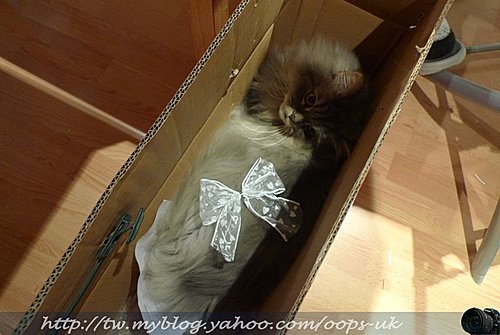 當然安斗還是沒有忘記他作貓的使命~火上加油雪上加霜,人家在佈置聖誕樹,箱子裡的枝葉都還沒拿出來他就整隻貓跳進去呈睡覺姿勢趴好了。