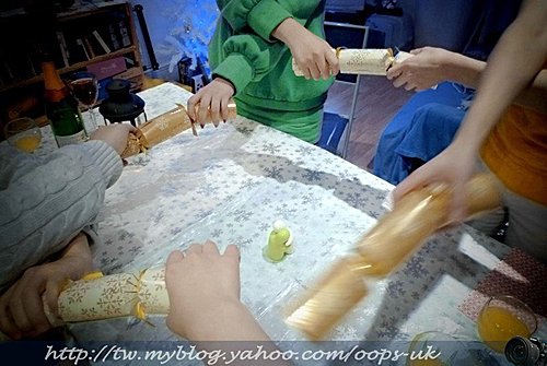 吃飽喝足壓軸好戲的前頭~拉炮 " Cracker:此乃聖誕節一種助興之物。其使用方式為:四人八手連拔,其力斷金。功能為:拉開之後可發出蹦的一聲嚇唬人+可穿戴金銀紅綠的紙帽照相+可拿來玩的神祕迷你小禮物。