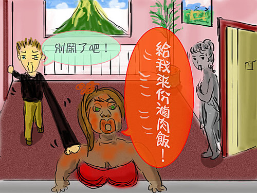 拉鋸戰過了20分鐘,當胖大衛說要打電話報警之後,這枚醉女還是睡在地上不醒人事,倒是男生彷彿有如神賜的力量,瞬間爆發,硬扯醉女的頭髮,還踢了她好幾腳,最後才把她拖出門外(在那當時,我多麼想也過去踹個幾腳阿!可是胖大衛說我們連碰都不能碰她,不然會被告哪!)。