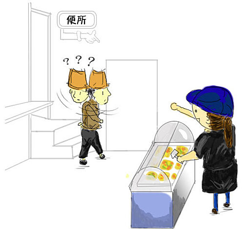 自從改變裝潢之後,餐廳與外帶區就只有一門之隔(以前是兩門),偏偏餐廳的客人要上廁所都會經過外帶區,於是我便開始被賦予指引光明道路這項神聖的任務!