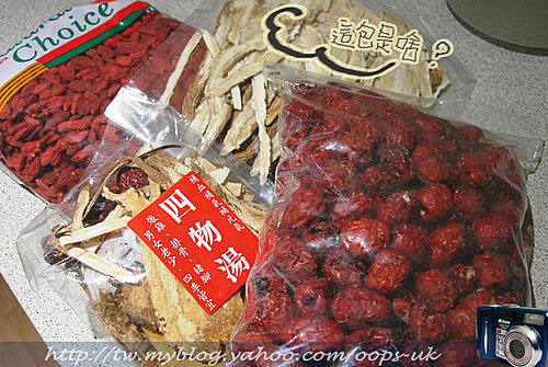 打開冰箱,只有牛奶,剛剛才喝還是餓,味增?不喜歡。打開冰庫有冷凍雞腿?不會弄。冷凍海鮮?還能吃嗎?眼前瞄到架上我娘前年寄來的五包四物湯、一大包紅棗、枸杞、還有那包白色不明補品。。