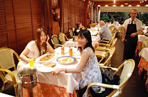 中秋夜在蘭布拉大道"La Rambla"上的一家餐館吃西班牙海鮮飯加水果紅酒~