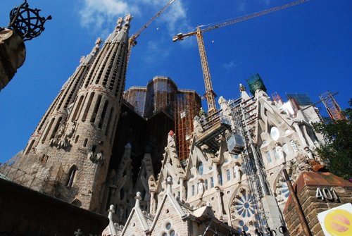 下午在盛名遠播的四隻貓餐廳 "4 Gats"用餐完,緊接著就要去宏偉的聖家堂 "Sagrada Família"(學生票€10.50):蓋到目前為止已經一百三十年還沒蓋好之高迪嘔心瀝血之作。一出捷運站就聳立在面前,聖家堂這樣般的曠世鉅作讓人嘆為觀止!高迪不是神人就是鬼才,能做到這樣般的令人肅然起敬毛骨悚然的地步真是不簡單哪!