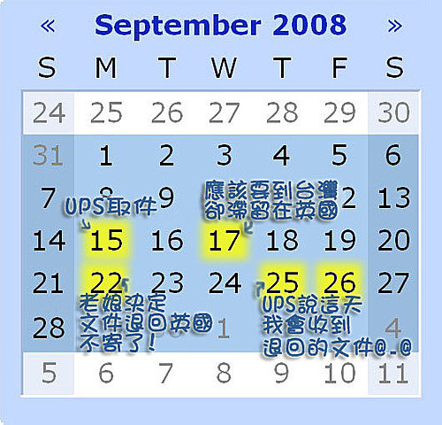 還是九月25日星期四。我決定把網路上的 UPS 所有資訊都印下來,帶去告訴學校老師說:我必須得回台灣一趟,因為 UPS 給我這麼大的驚喜!後來老師就說他要幫我跟 UPS 溝通,希望我不要在下禮拜正式開課時缺席。但是溝通結果還是跟我之前的情形一模一樣,英國的客服完全是搞不清楚狀況也不願意正視我的問題,老師問到的唯一新資訊是我問不出來的是: